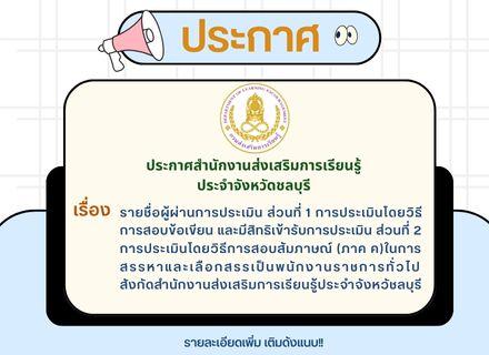 ประกาศสำนักงานส่งเสริมการเรียนรู้ประจำจังหวัดชลบุรีเรื่อง รายชื่อผู้ผ่านการประเมิน ส่วนที่ 1 การประเมินโดยวิธีการสอบข้อเขียน และมีสิทธิเข้ารับการประเมิน ส่วนที่ 2 การประเมินโดยวิธีการสอบสัมภาษณ์ (ภาค ค) ในการสรรหาและเลือกสรรเป็นพนักงานราชการทั่วไป สังกั
